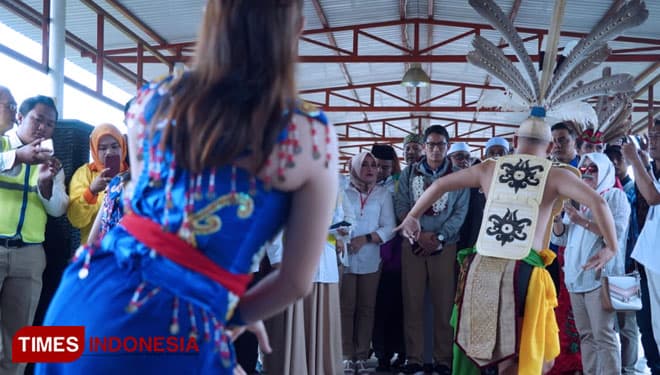 Cawapres Nomor urut 02, Sandiaga Salahuddin Uno disambut dengan upacara adat Tetek Pantan saat tiba di Bandara Tjilik Riwut Palangkaraya, Kalimantan, Senin (04/02/2019). (FOTO: Tofik For TIMES Indonesia)